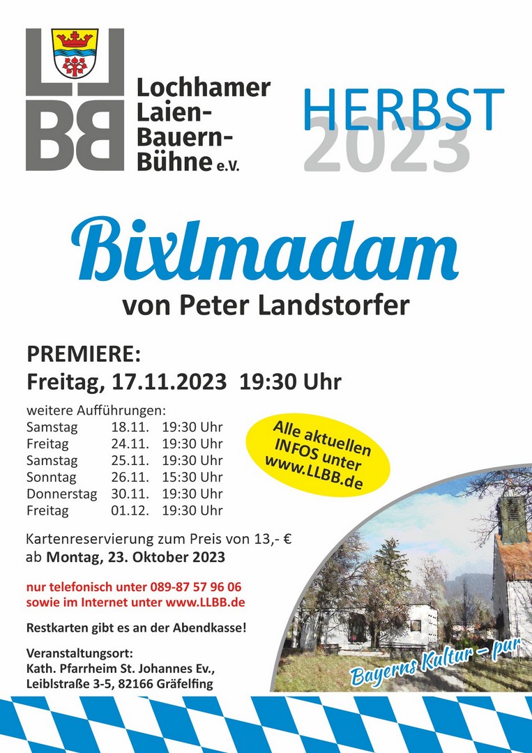 Aufführungen der beiden Stücke finden an den kommenden Wochenenden statt - siehe Theaterplakate. Und wer noch mehr Lust auf Theater hat, der könnte im benachbarten Lochham vorbeischauen. Dort spielt die Lochhamer Laien-Bauern-Bühne ab dem 17. November die „Bixlmadam“ von Peter Landstorfer.