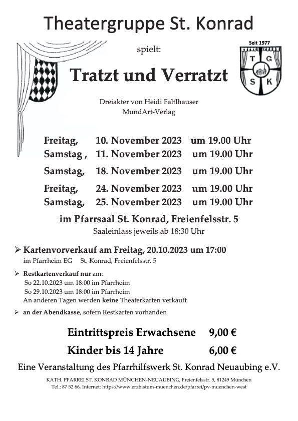 Theaterfans können sich freuen. Am Wochenende stehen gleich zwei Premieren ins Haus. Ab Freitag, 10. November, spielt die Theatergruppe St. Konrad „Tratzt und verratzt“ von Heidi Faltlhauser. In eineinhalb Stunden geht es um den Hüttenwirt Xare, der am liebsten auf seiner Alm ist und von touristischen Störungen wenig hält. Bis der Reporter Sunny nebst Gehilfen erscheint und Erstaunliches ans Licht bringt.