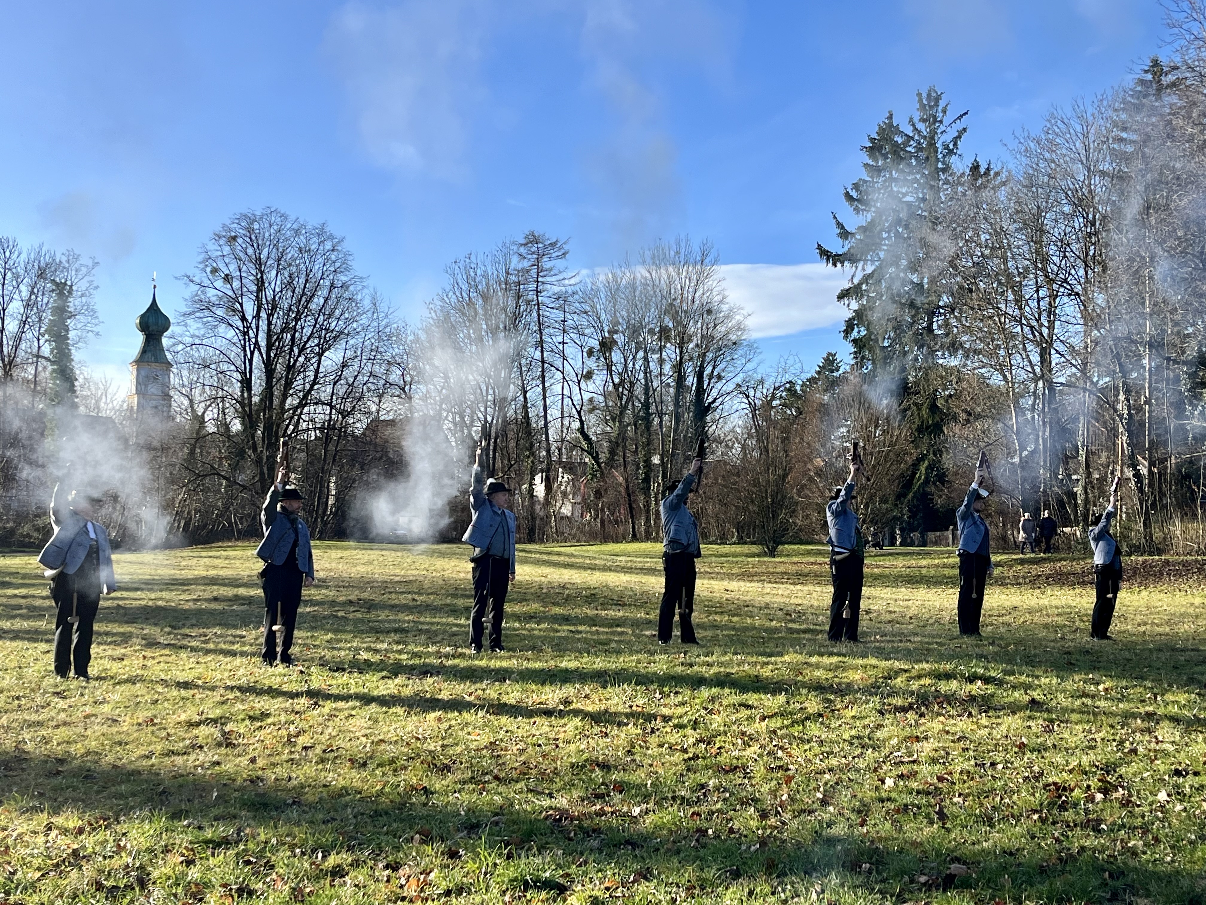 Zum Einsatz kamen Handböller mit einer leichten Schwarzpulvermischung. „Wir müssen sehen, wie weit wir damit reichen“, meinte Schießmeister Johannes Menzinger. Salut, Gruppenfeuer, Einzelfeuer, Reihenformationen sind im Repertoire, die an den drei wichtigen Punkten geböllert werden.