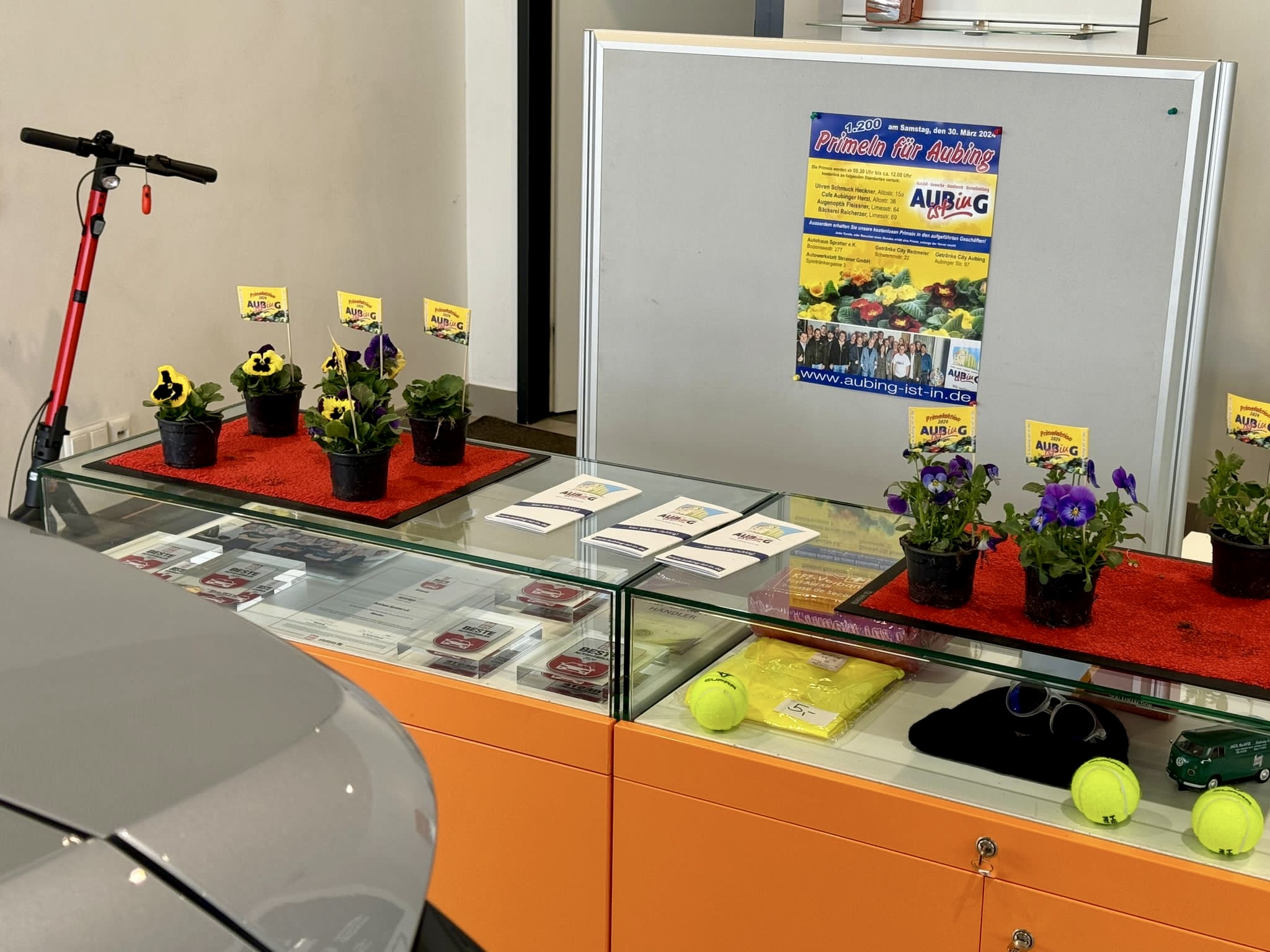 Die Idee zu dieser Aktion an die treue Kundschaft entstand vor einigen Jahren. Immer am letzten Samstag im März verteilen die Mitglieder von „Aubing ist In“ in ihrer sogenannten „Primelaktion“ 1.000 Blumen an die Passanten, und zwar bei Uhren/Schmuck Heckner und Café Aubinger Herzl an der Altostraße, bei Augenoptik Fleissner und der Bäckerei Reicherzer an der Limesstraße, beim Autohaus Spratter, bei Getränke City Reitmeier und Getränke City Aubing sowie in der Autowerkstatt Strixner.