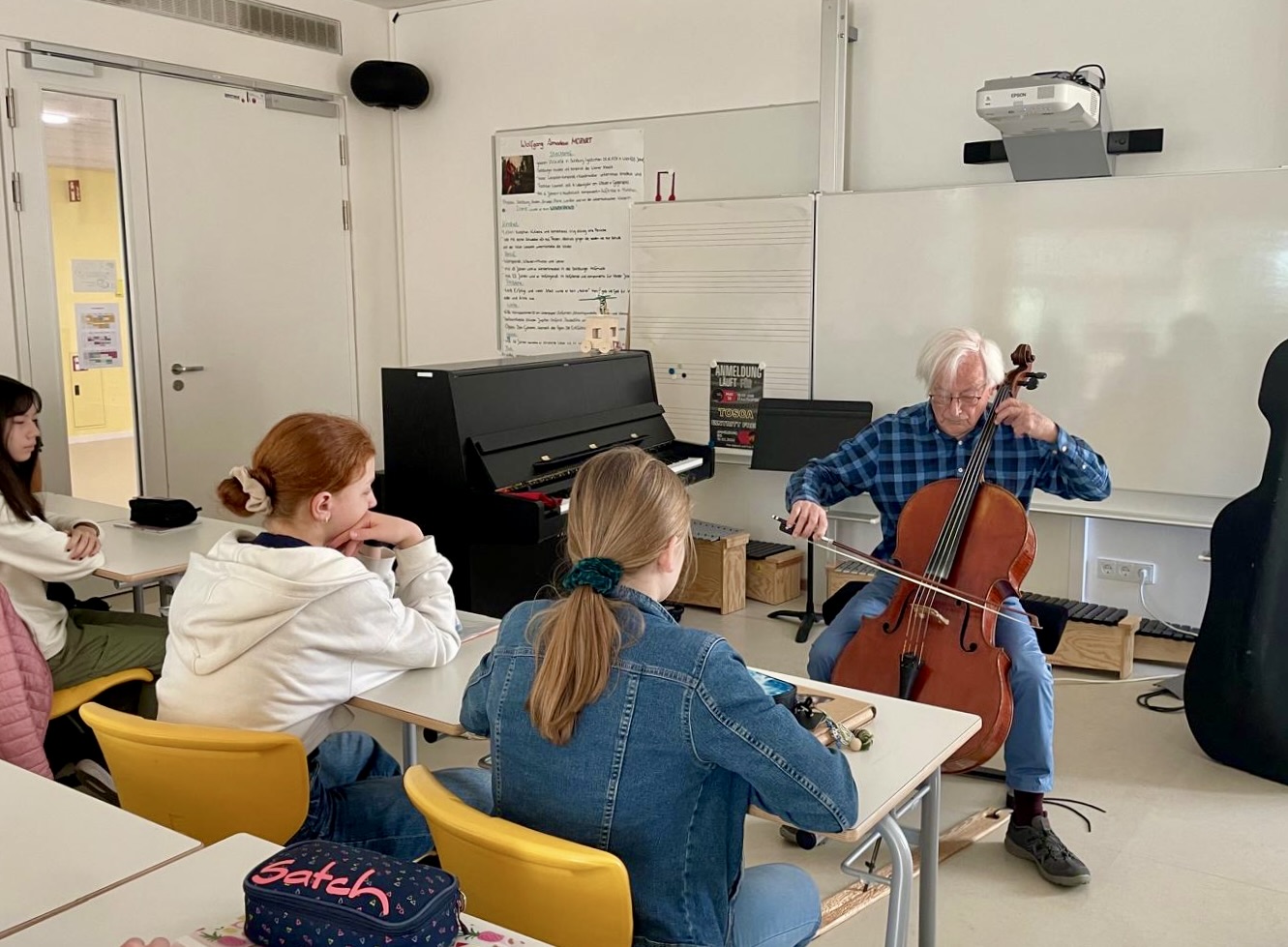 Im Musikunterricht hatte die 7G des Freihamer Gymnasiums soeben über Berufsmusiker gesprochen, sich angeschaut, was zu einem Orchester gehört, wer Konzertmeister und wer Stimmführer ist. Der Besuch des ehemaligen Solocellist der Münchner Philharmoniker Heinrich Klug kam nun wie gerufen, um die Theorie erlebbar zu machen.