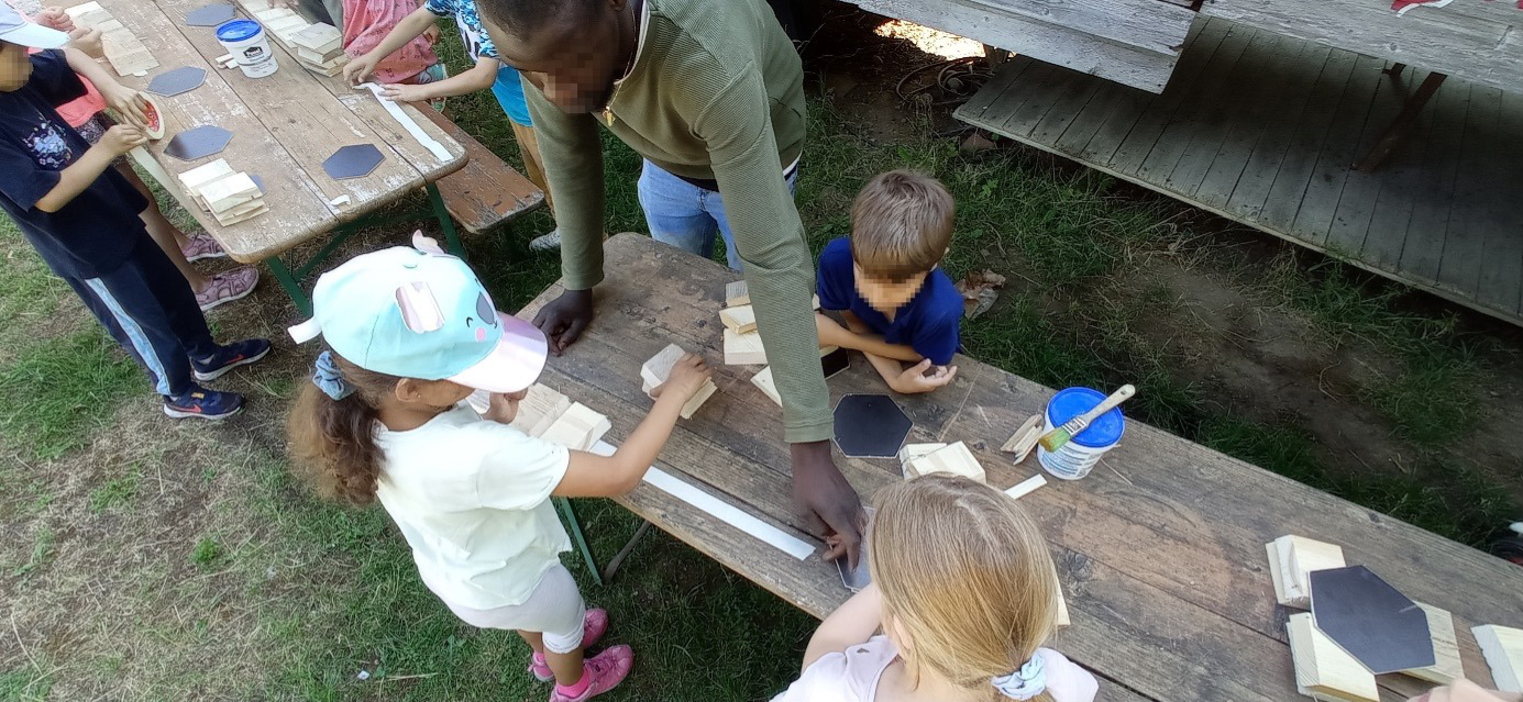 Wann haben Kinder aus der 1. Klasse und Maurer-Azubis zusammen Unterricht? Antwort: Wenn sie gemeinsam “Lernen durch Engagement” umsetzen! Diese bemerkenswerte Kooperation fand zwischen den Schülerinnen und Schülern der Klasse 1g der Grundschule an der Helmut-Schmidt-Allee und den Maurer-Azubis der Adolf-Kolping-Berufsschule München statt. Dabei trafen die zumeist sechsjährigen Kinder auf zum Teil erwachsene Azubis. Gemeinsam arbeiteten sie daran, sechseckige, wabenförmige Insektenhotels zu erstellen, die im Freiluftgarten des Nachbarschaftstreffs Freiham aufgestellt werden. Dieses inspirierende Projekt wurde im Rahmen des Unterrichtsprinzips “Lernen durch Engagement” umgesetzt. Der Unterricht fand auf der Kinder- und Jugendfarm Neuaubing statt. Diese besucht die Grundschulklasse jeden Freitag und die Kinder erfahren Wissensvermittlung mit praktischen Aufgaben, wie z. B. Saftmachen, Plätzchen backen, Filzherstellen und natürlich auch die Tierpflege. Unter der fachkundigen Anleitung der Auszubildenden lernten die Kinder der Klasse 1g von Klassenleiterin Sabrina Reuter und Julia Geisler, wie man die einzelnen Waben für die Insektenhotels zusammensetzt und verleimt. Während der Wartezeit, bis der Leim aushärtete, wurden die Rollen getauscht.