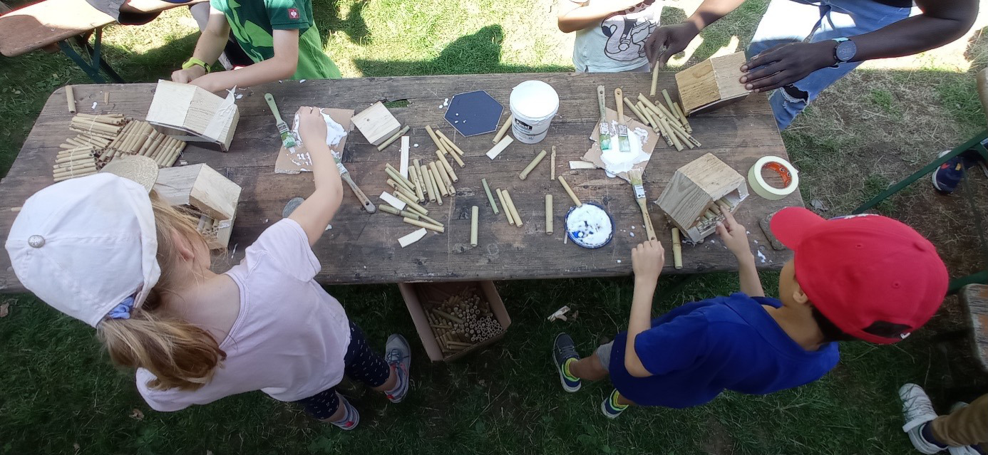 Die Kinder zeigten nun den Azubis, welche Arbeiten sie sonst auf der Kinder- und Jugendfarm Neuaubing ausführen. Neben der Tierpflege verrieten die Kinder ihre liebsten Orte und sichersten Verstecke auf dem Gelände. Sportlich wurde es auch, als fünf Grundschüler versuchten, einem Azubi den Fußball abzuluchsen. Nach dieser Phase der Annäherung zwischen den doch sehr unterschiedlichen Altersgruppen waren wieder die Azubis an der Reihe. Sie unterstützten die Kinder vorbildlich beim Ausfüllen der Waben mit Bambus und Schilf.