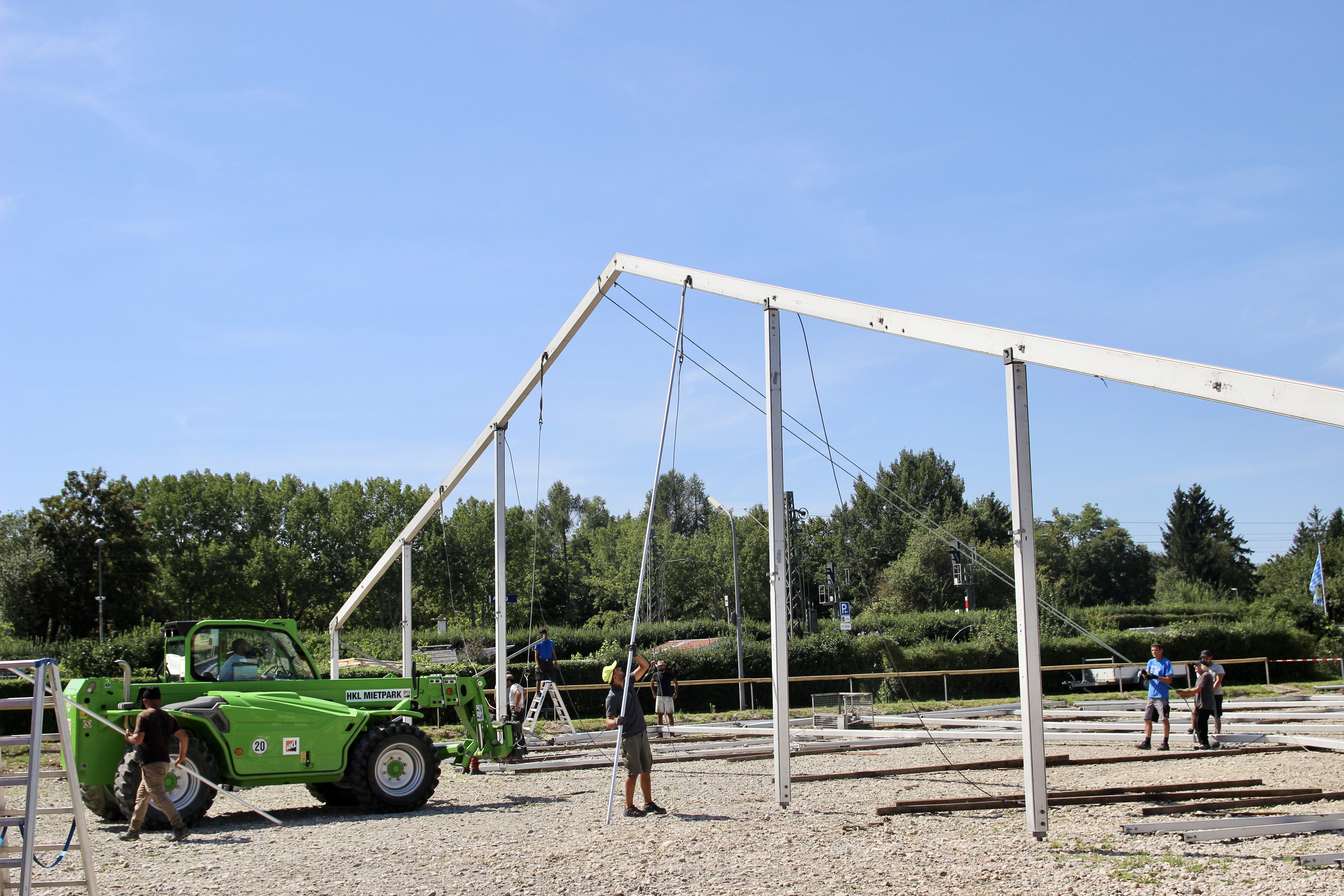 Zwei volle Tage sind fürs Aufstellen des Festzeltes auf der Belandwiese eingeplant. Den Startschuss dafür gab der Freiflächenverein München-Aubing e.V. „Wir haben schon sieben Uhr in der Früh die Fläche fürs Zelt vermessen und mit rot markiert“, erzählte Vereinsvorsitzender Sebastian Kriesel. „Die Wiese ist eben eine ganz besondere mit ihrer dreieckigen Form. Wenn das Zelt von Beginn an nicht richtig steht, sind wir verloren. Dann passt alles nicht so recht hin.“